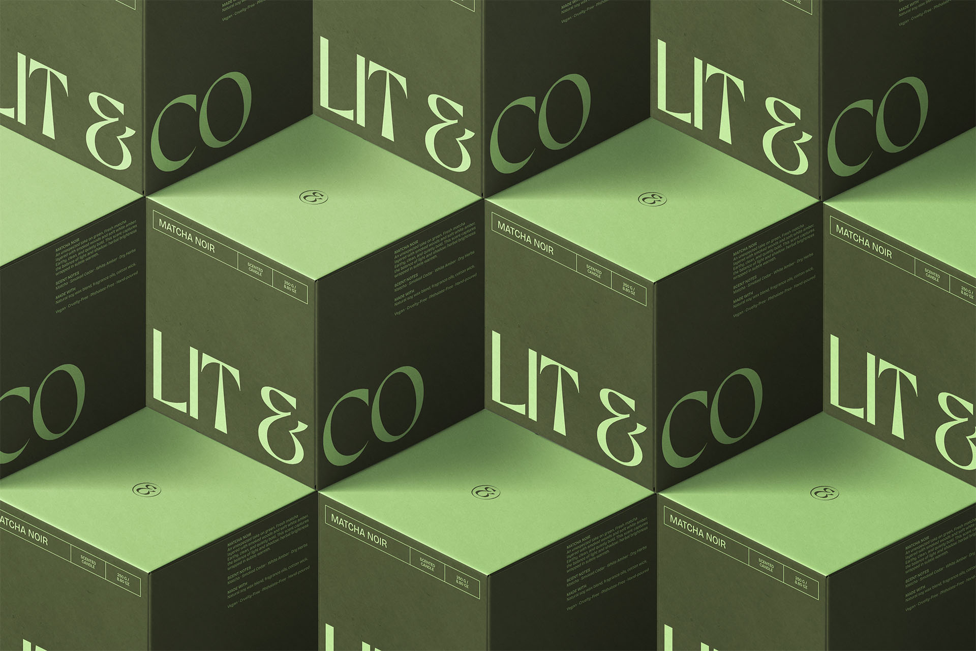 Lit & Co is a modern candle brand built around sensory contrast and everyday ritual. The identity explores balance, between light and dark, through bold color pairings and minimalist design. Each scent is represented by its own distinct palette: deep purple with a cool lavender accent, and forest green paired with a vibrant lime. These combinations reflect the layered nature of the scents while creating a strong visual system across the line.